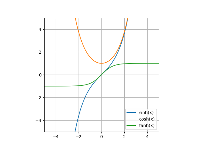sinh(x) = (ex - e-x)/2 = 1/csch(x) , cosh(x) = (ex + e-x)/2 = 1/sech(x) , tanh(x) = (ex - e-x)/(ex + e-x) = 1/coth(x)