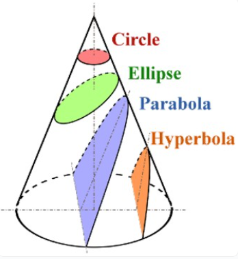 먼저 원뿔곡선(이차곡선)에서 어떻게 타원, 포물선, 쌍곡선이 만들어 질 수 있는지 가장 간단한 예를 들어