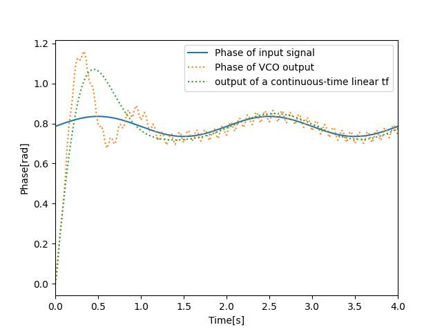 그럼 이제 PLL이 원 입력신호의 주파수와 위상을 변화시켜 얼마나 잘 추적하여 동기화(synchronization)시키는 지 동작시켜보고, 모델링한 전달함수의 연속 시간/주파수 응답과 함께 비교해 보자!