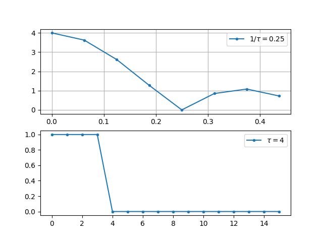 ax[0].plot(f[:N//2], abs(y)[:N//2], '.-', label=r'$1/\tau = $'+str(1/4))