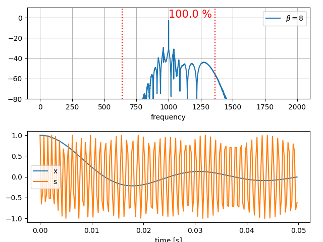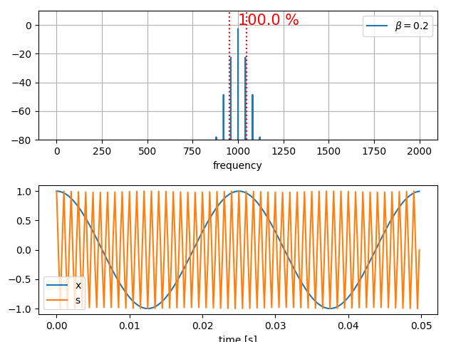 일반적인 메시지 x=sinc(2*40*t)로 확장한 결과 카슨 대역폭 내 전력이 소수 첫째자리에서 반올림하여 100% 집중됨을 확인할 수 있다.