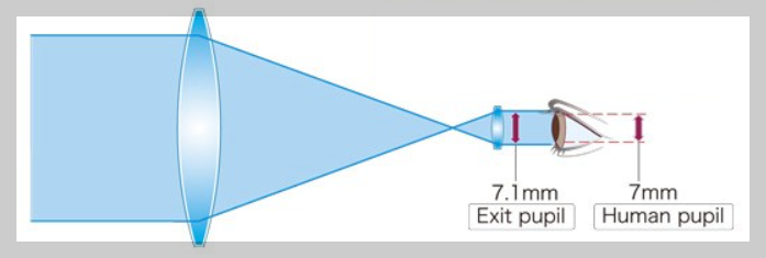 위 그림에서 왼쪽 큰 대물렌즈와 오른쪽 작은 접안렌즈 사이에 맞각인 삼각형 2개가 초점거리의 비로 닮았기 때문에 이는 곧 물리적으로 배율을 의미하는 (대물렌즈 구경/사출동공)와 같다고 할 수 있다. 여기서 사출동공(exit pupil)은 접안렌즈를 통해 빠져나오는 빛다발의 직경을 의미하고 결국 (접안렌즈의 초점거리/F수) 와 같다.