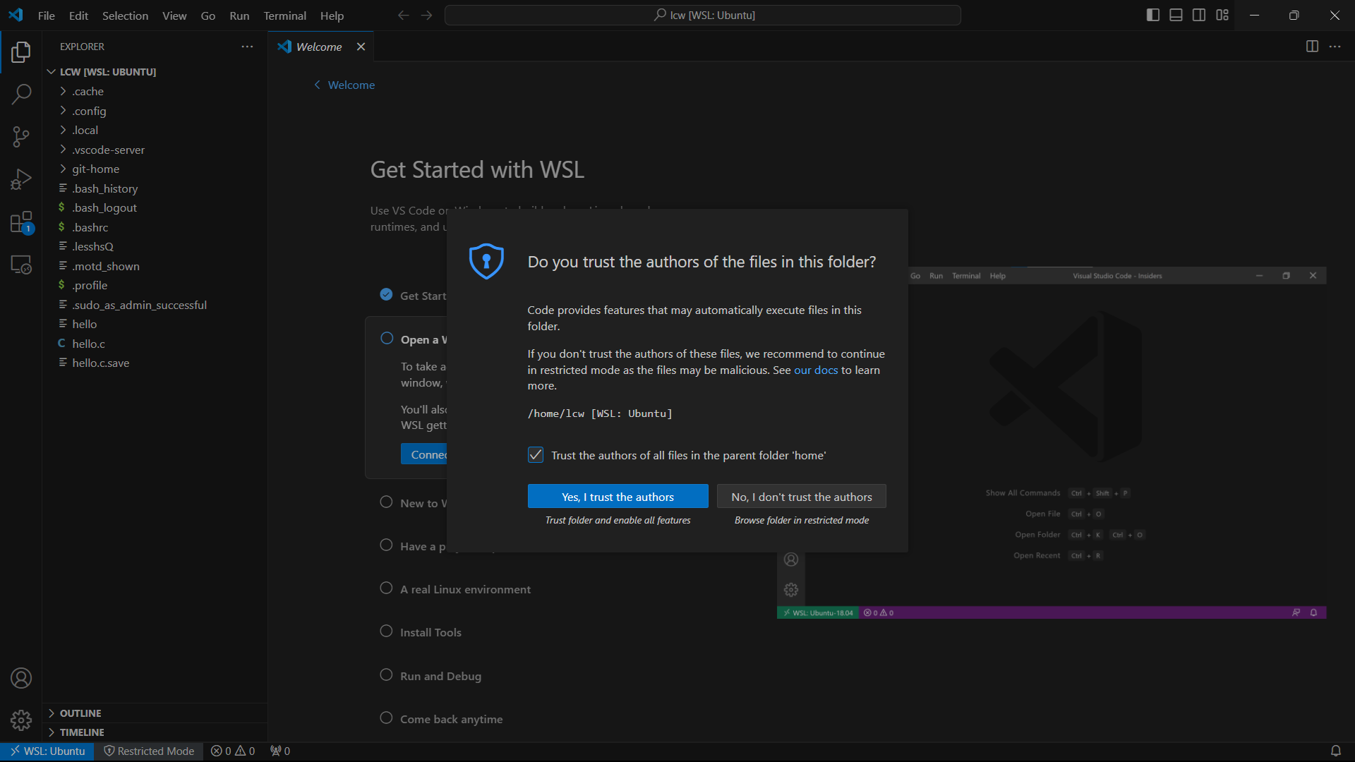 4. wsl 홈 디렉토리를 작업폴더로 신뢰하고 엽니다.