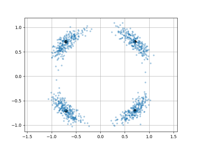 우리는 램덤한 4개의 심볼을 생성(아래 IQ성상도에서 검은 큰점)시키고,