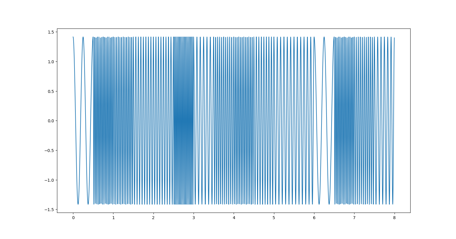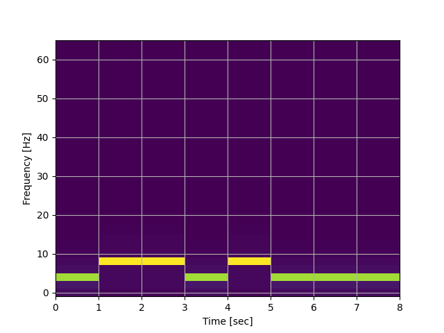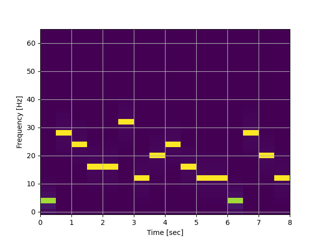 아래 예제는 단순하지만,,, 메시지 신호 [0, 1, 1, 0, 1, 0, 0, 0]와 임의의 PN코드로 Tc=0.5s, 총 8초간 fast FHSS 변조신호를 생성하고 이를 스펙트로그램으로 관찰하는 시뮬레이션입니다.