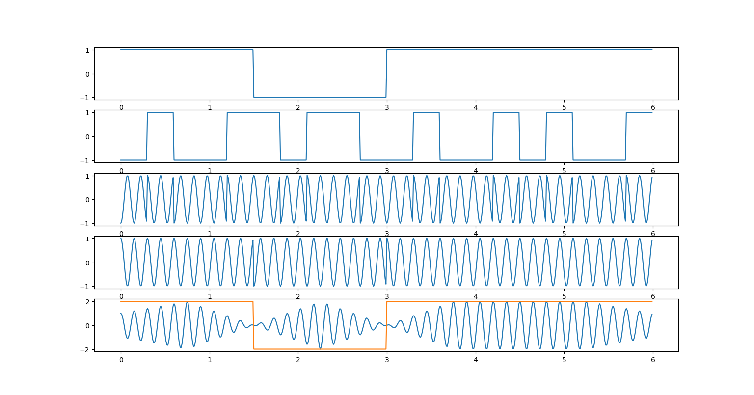 먼저 임의의 메시지 데이터 [1, 0, 1, 1] 를 1.5초에 한 비트씩 총 4 비트 채널 인코딩(NRZ, 6초)한다고 가정합니다. 그리고 상호상관 (Cross-Correlation) 이 작은 신호 PN code c(t) 즉 chip [0, 1, 0, 0, 1] 를 채널 1 비트 당 반복해서 캐리어와 같이 곱해주어 s(t)를 생성합니다. 여기 송신측에서는 대역을 5배로 확산(spreading)시키고,