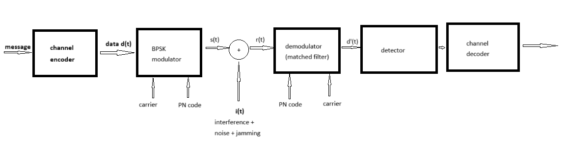 수신측 r(t)에서 다시 PN code c(t)를 곱해서 대역 축소(despreading) 하고 (캐리어를 곱하여 적분하는) 정합필터를 통과시키는 복조과정과 채널 디코딩하면 메시지 데이터를 복원할 수 있습니다.