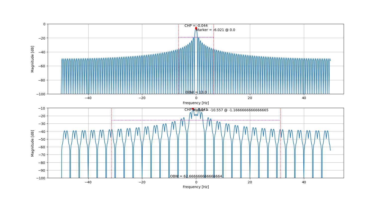 실제로 대역폭확산비 Nc 혹은 processing gain은 위 그래프에서 99% OBW(13.0 -> 62.6) 변화로부터 약 5배 됨을 검증할 수 있습니다.