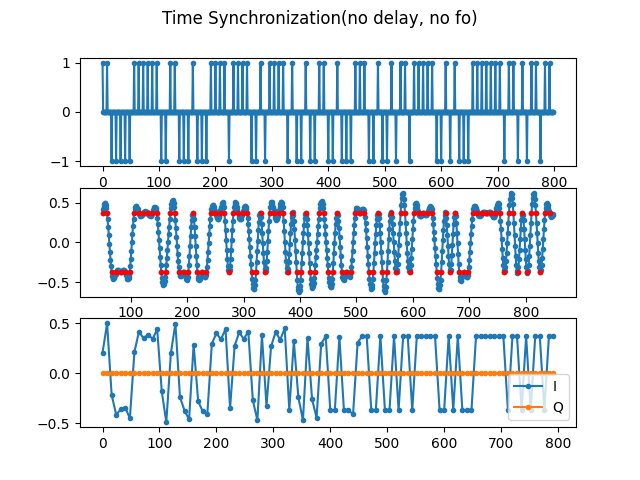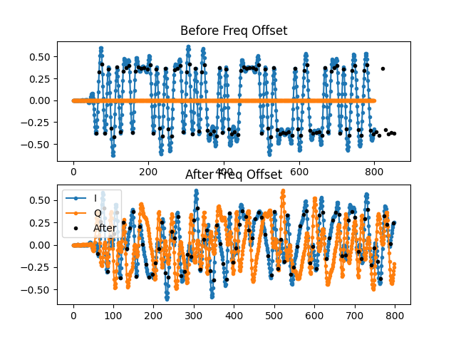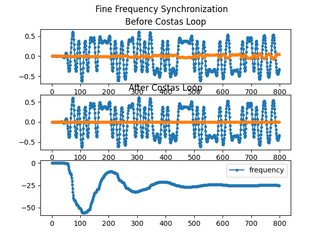 참 신통방통하게도 Costas Loop를 이용하여 나머지 미세주파수도 동기화 ( -25Hz 에 수렴 ) 되는 것을 약 400 샘플타임부터 확인할 수 있습니다. Q신호들도 0에 수렴하고요.