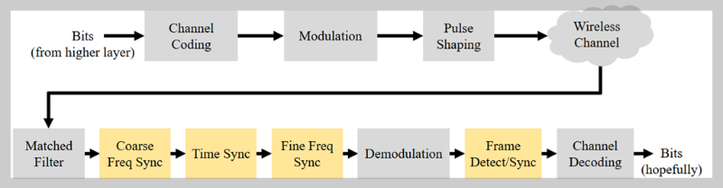 대부분의 통신 프로토콜은 패킷/프레임을 대부분 사용합니다. 수신기에서 우리는 새 프레임이 언제 시작하는지 식별할 수 있어야 하는데, prefix에는 수신기가 프레임의 시작을 감지하는데 사용하는 동기화 시퀀스가 포함되어 있으며 수신자가 미리 알고 있는 시퀀스입니다. 간단히 정합필터 출력과 비슷하게 아래처럼 구할 수 있습니다.